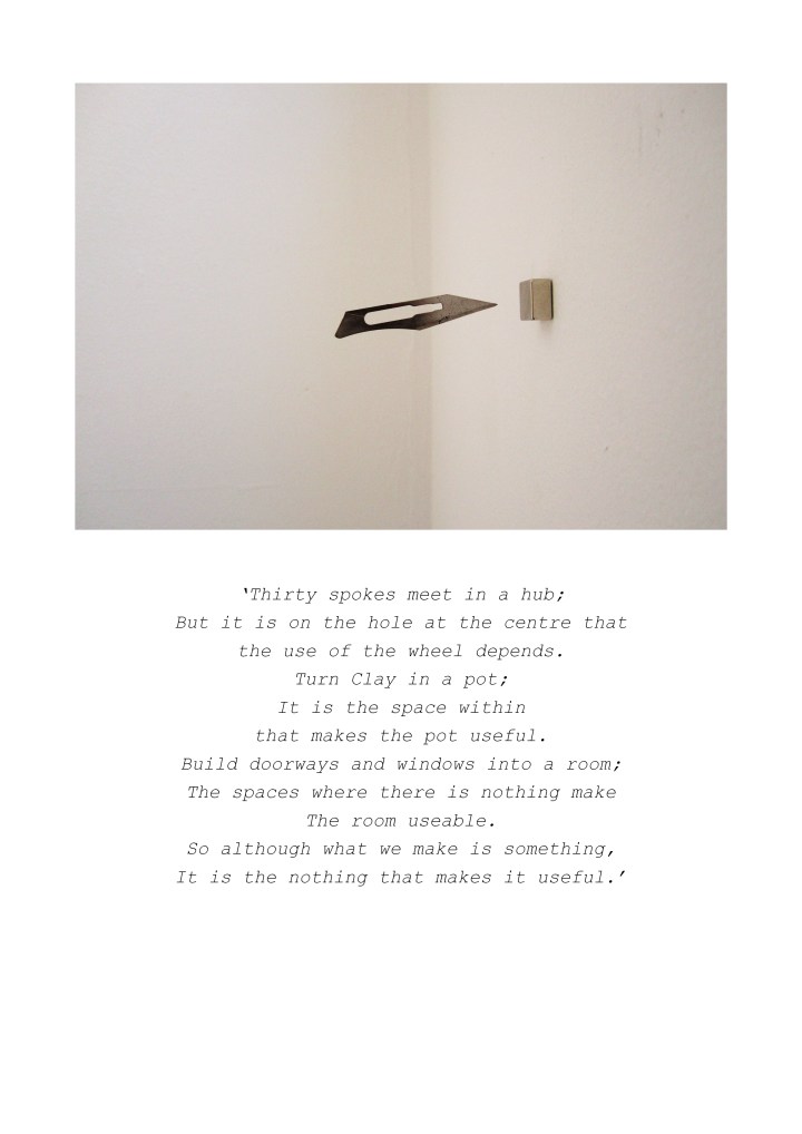 Kirstin Norwood work ‘Gaps‘ shows her micro sculpture accompanied by an extract from 6th century text Tao Te Ching written by Taoist philosopher Lao Tzu.