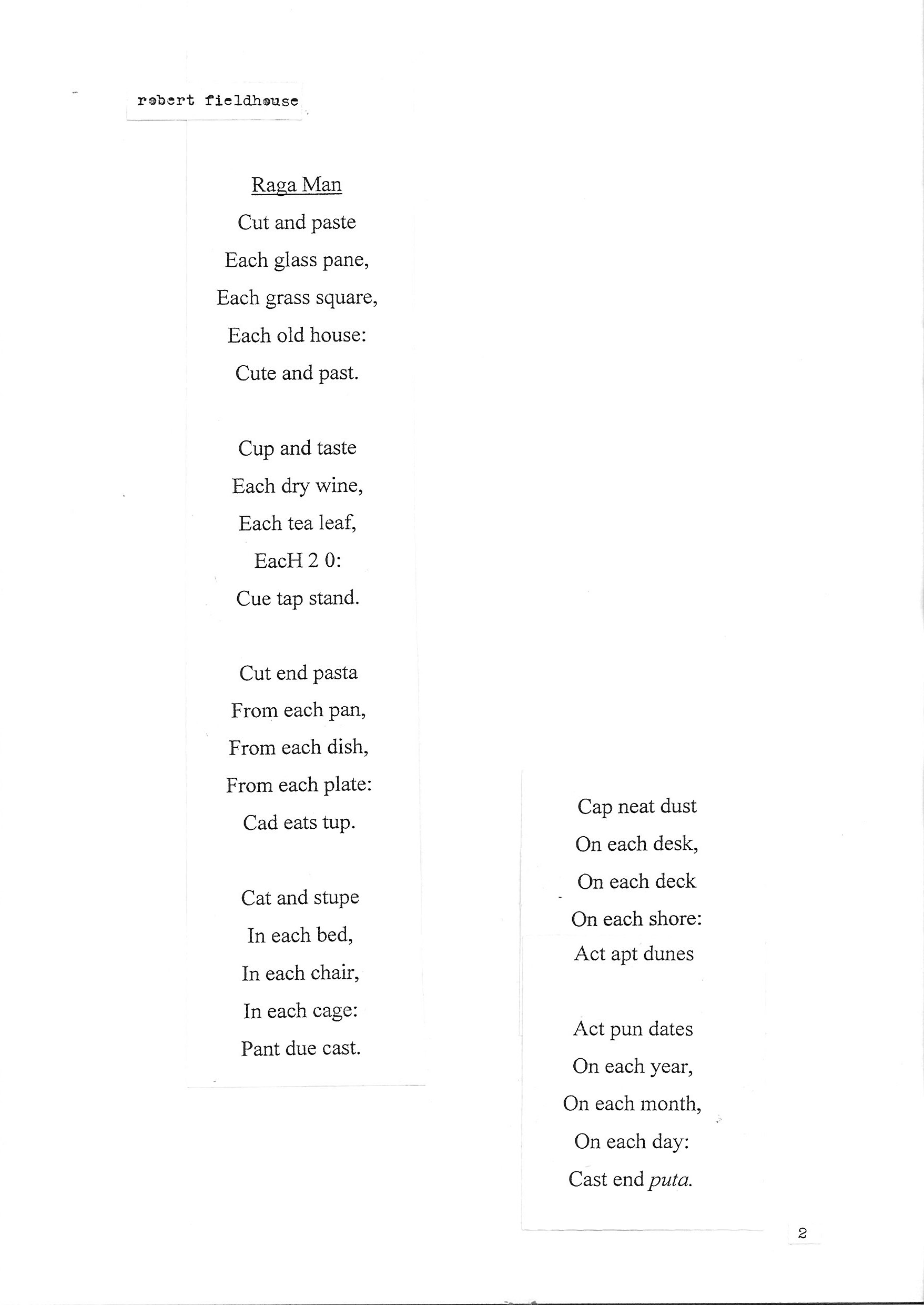 Raga Man, a submission by Robert Fieldhouse to the Copy Paste issue; I really like it. Playful, cunning and quick, this poem delights, beguiles and tickles. These stunted stanzas follow formats seemingly simple, allowing the conscience an unencumbered phonetic, rhythmic pleasure. It reminds me of the Oulipo experiments: